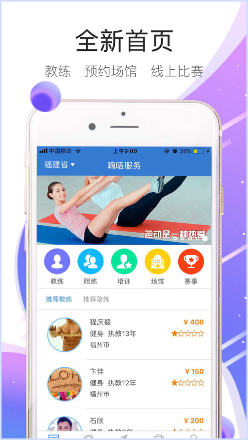 1、嘀嗒运动app下载后为用户推荐各种类型的教练和陪练信息,方便用户进行选择;