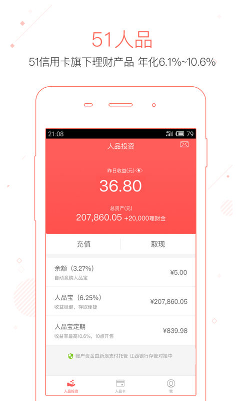 51人品软件是一款上市公司51信用卡旗下平台。提供精选的投资商品。投资商品的信息看起来透明。及时把握数据信息变动,交易进一步编辑,收益更好。可以浏览省心投、散标直投、转让专区等投资商品,阅览可投资的商品,简单掌握投资时的限制。