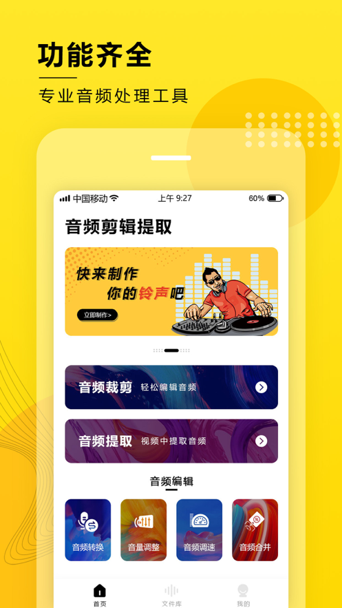 音频提取: 将喜欢的短视频电影导入,轻松提取视频里的背景音乐音频,做成手机铃声配音铃声,可玩性十足;