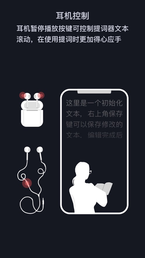 在手机与耳机连接的情况下,打开软件进入文本提词模式或视频提词模式后,单击线控耳机控制开关即可实现提词区域播放及暂停功能。(支持有线耳机及无线蓝牙耳机)目前适配苹果原有线耳机、无线耳机AirPods
