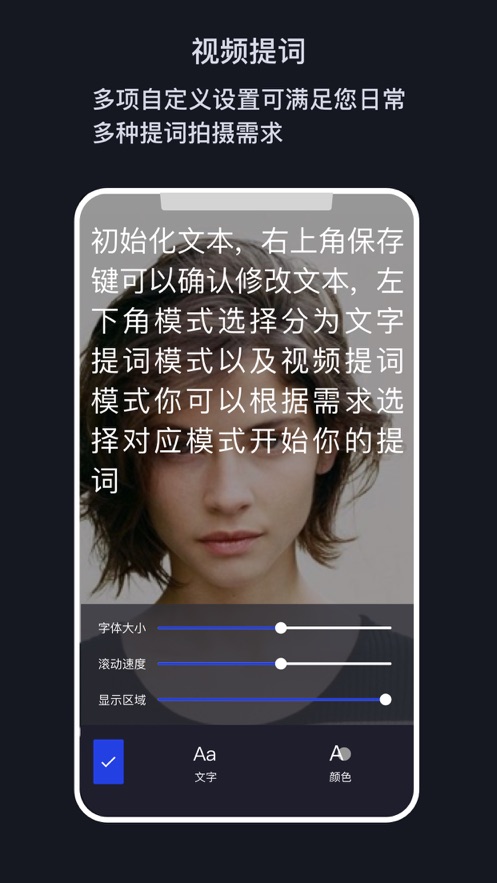 进入提词模式后你可以通过设置按钮修改设置参数,包括字体大小、滚动速度、显示区域、字体颜色、背景颜色、以及镜像模式。