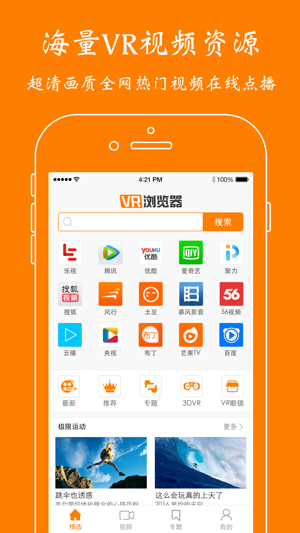 VR浏览器苹果版是一款专业的视频浏览器,用户可以通过它免费观看3D电影和全景视频,用户使用时无需下载视频插件,可直接在线进行观看。
