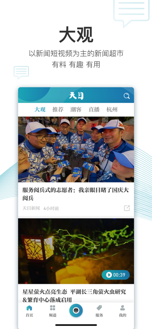 天目新闻客户端聚焦热点新闻,立足浙江,有深度的推送长三角相关视频资讯,同时它还兼顾社交功能,用户可以通过它随时随地上传分享生活生活视频。