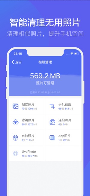 照片清理:为您清理相似照片、无用截图、滤镜原始照片,同时还能筛选连拍!