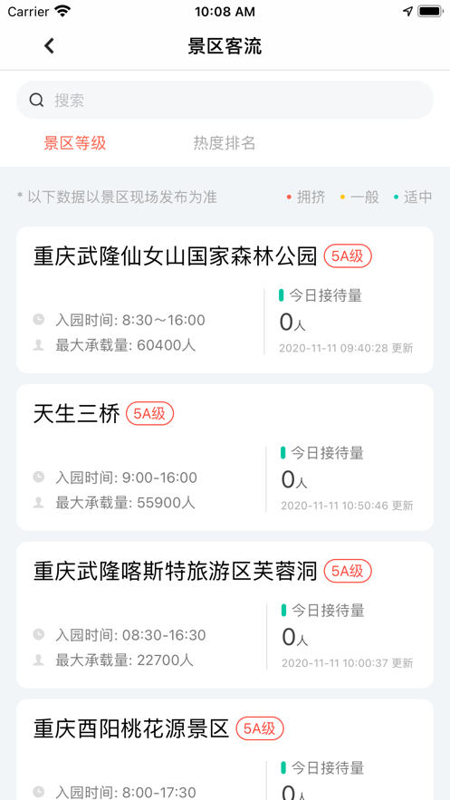 景区客流:囊括重庆全部A级以上景区,实时查看景区客流情况,制定最优行程;