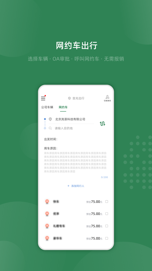 出行合作多家租车公司,政企员工可在吉光出行提交申请,通过后自动发单,