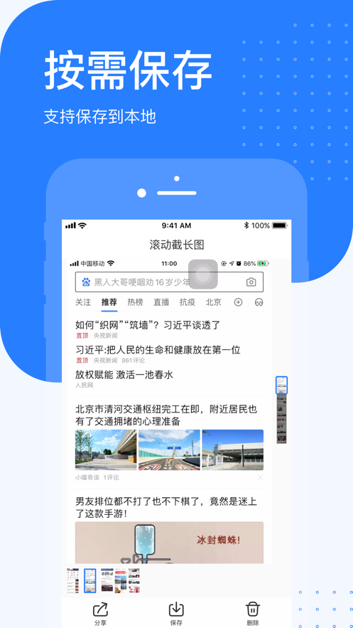 滚动截长图app是一款适配各个苹果系统的截图软件。这个软件有很多应用程序。这个软件有很多方便使用的服务。为大家提供更多的服务功能。手机使用的截图工具一般只能用当前页面的截图。这个工具帮助用户截图截图页面,并截图您想要的页面。