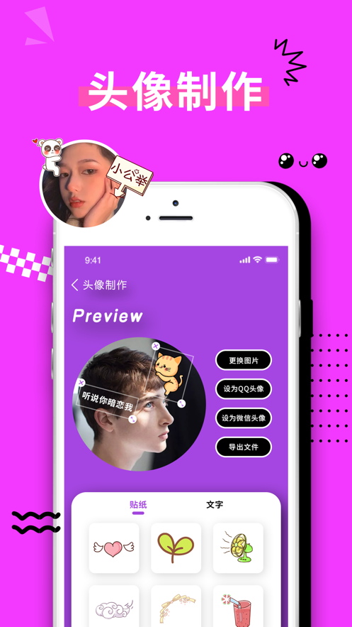 【个性头像制作】精心挑选多种贴纸搭配多种文字,营造多样化聊天氛围,每一张都可以是不同风格的自己,轻轻松松嗨翻全场。