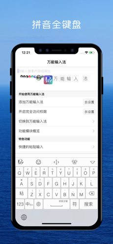 万能输入法苹果版是一款支持多种输入方式的手机输入法应用软件,在这个机不离手的年代,手机俨然在我们的日常生活中扮演非常重要的角色,而输入法又是手机的重要部分,选择一款好的输入法,打字的效率也会提高。