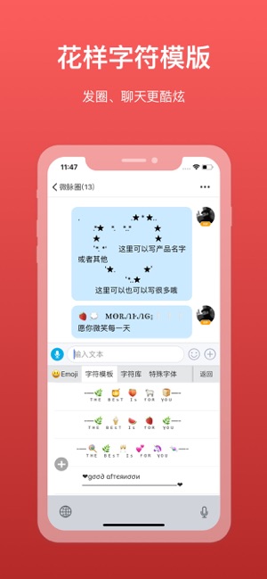 微商输入法iOS版是专为苹果手机微商用户打造的一款输入法软件,软件有着特殊字体、常用语、特殊表情符号、花样字模板、词库更新等众多功能,帮助用户快速录入,非常的方便快捷!
