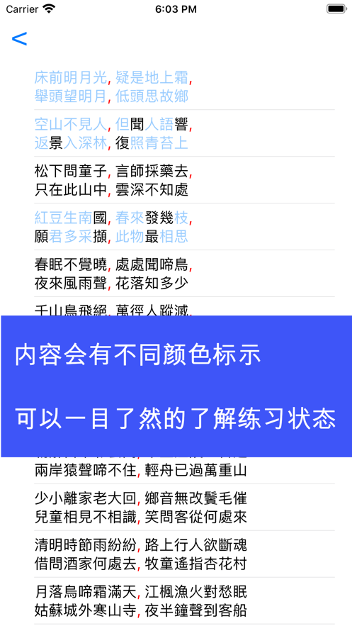 选择练习题时, 内容会有不同颜色标示,可以一目了然的了解练习状态