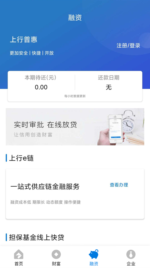 上行普惠平台产品包括供应链融资、小微快贷、财富管理、资金存管等,上行普惠app下载之后帮助用户轻松理财,软件为小微企业提供融资、财富管理、资金管理等功能,帮助企业更好的发展,感兴趣的用户欢迎来yn下载站下载使用。