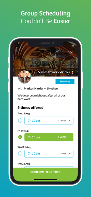 易于设置,100%免费,现在具有强大的1:1和组计划功能!使用CatchApp查找会议的最佳时间。 多次邀请您的被邀请者,并邀请他们选择最合适的人。 受邀者甚至不需要该应用程序或帐户即可参与! 适用于所有日历(Apple,Google和Outlook)。
