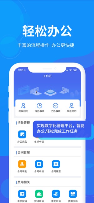 3、轻松办公、及时送达,工作区提供相应行业化应用。如:行政管理、合同管理、费用相关、公文管理、人事管理、销售管理、仓库管理等。