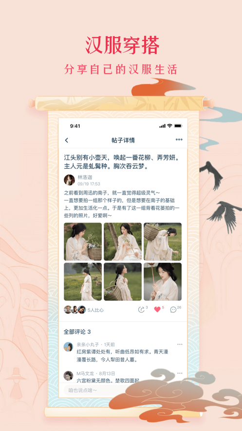 3、美照发布:支持您发布和分享您自己的汉服美丽照片,您可以与同一个城市的同袍约会,展示自己的穿搭