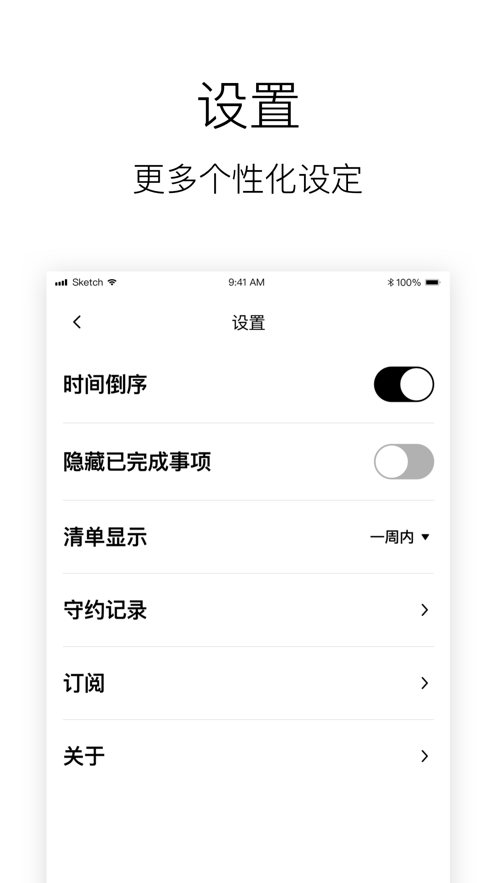 设置版面:个性化的时间正序或倒序,让你随自己喜好,查看清单的时间顺序。完成的事项,可选择隐藏,则清单版面将只显示未完成的事项。当然设置中 ,你依然可以找到已完成的事项。关于清单,你还可以选择只查看今日与次日、一周内、全部,这方便你聚焦在短期与所有事项,更好的管理计划的实施可能。