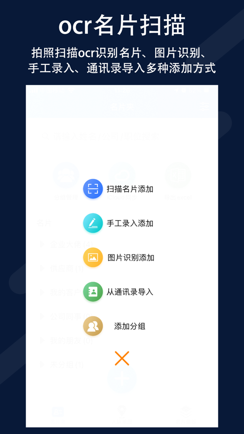 【OCR名片扫描】拍照扫描OCR识别名片、图片识别、手工录入、通讯录导入多种添加方式。快速识别,一键保存名片夹或者通讯录。