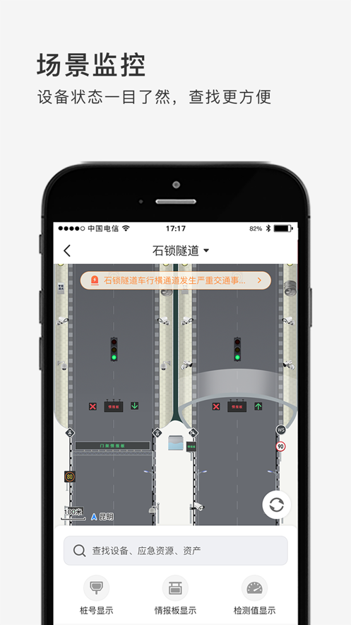 1.场景监控板块:实现高速机电设备和视频监控设备的远程监测和自动控制,并提供智能化事件检测及分析处理等功能,大大减少运营管理人员,节约运营成本,提高运营管理效率。