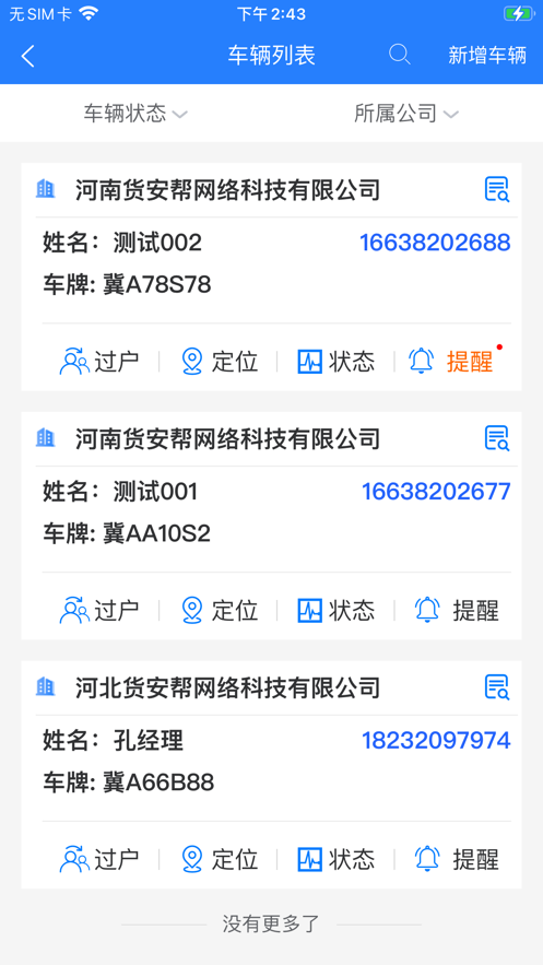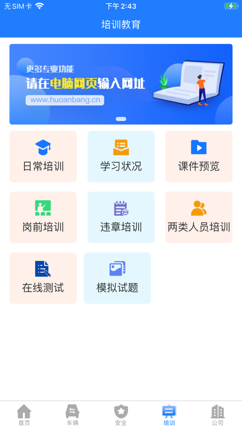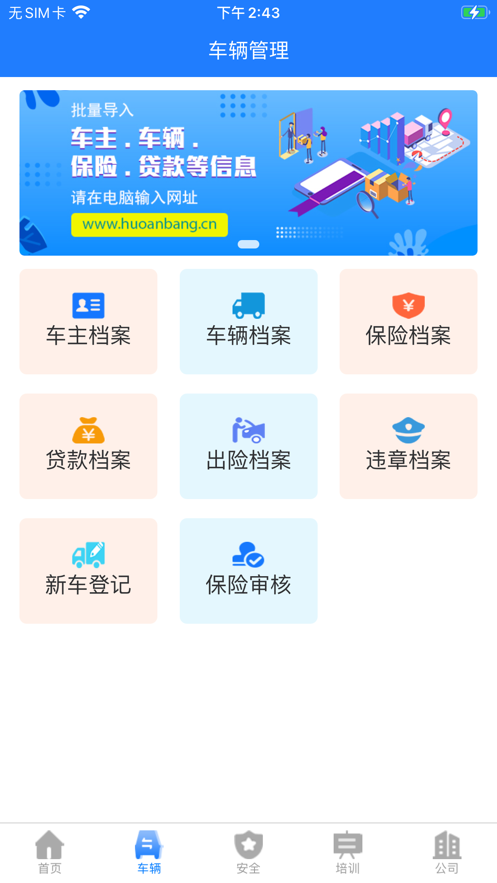 货安帮公司端app系统具有操作简便、界面友好、功能强大,可提供了完备的车辆管理,包括车辆电子技术档案管理、 车主驾驶员管理、车辆报价单、出险管理、违章管理、保险管理,年审、合同、保险、营运证、GPS到期等各项到期业务提醒,货安帮公司端软件公司断小程序、短信群发系统、财务管理系统、安全管理、驾驶员安全培训系统于一体,有需要的用户欢迎来yn下载站下载使用。