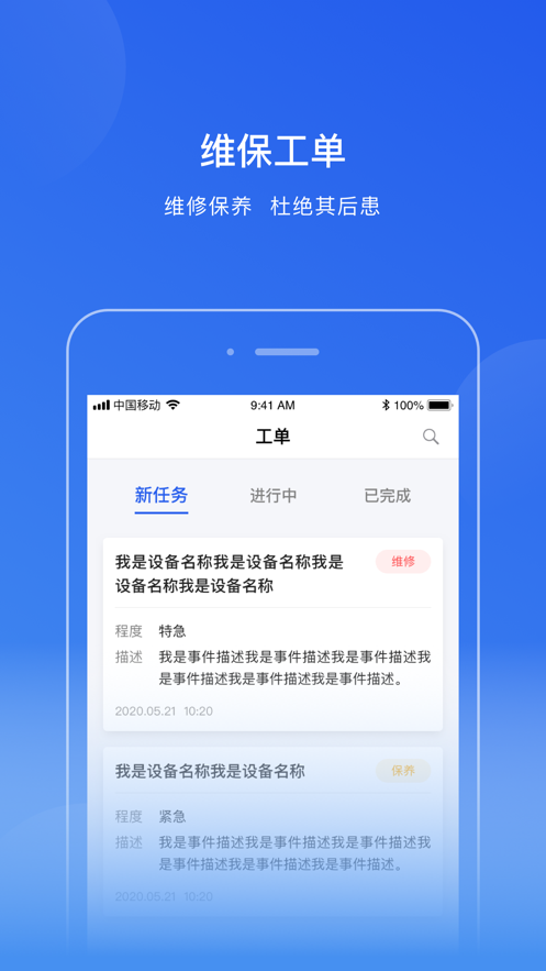 任务形式工单:警报,隐患,巡检,故障,维修,保养都是以任务的形式展现,处理,审批,灵活自主,实现全过程记录,所有历史操作可追溯。