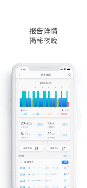 作为你的枕边睡眠伴侣应用,我们也会帮助你了解更多你的睡眠习惯,捕捉你在睡眠过程中的梦话以及呼噜,白天的生活充满乐趣,那么夜晚的未知状态下的乐趣我们也不能放过,记录你的梦话,了解你的睡眠乐趣。同时该软件还具有智能闹钟的功能,在清晨浅睡时刻,柔美、轻松的原创闹钟铃声将你唤醒。让起床不再痛苦,新的一天,精力充沛!