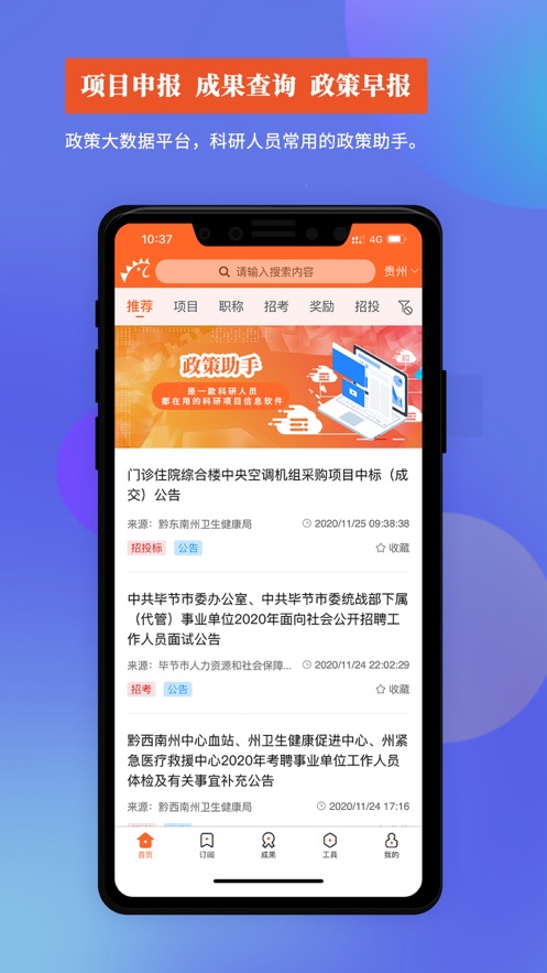 政策助手app是政策法规大数据服务平台,是一款科研人员都在用的科研项目信息软件,实时推送全国科研项目申报信息、科研成果信息、职称申报信息、补助补贴信息、比赛信息、政策信息、招考信息,数据来源于全国各省、市(州)、区(县)两万多个网站公开信息,权威可信,政策助手软件下载之后让用户实时掌握各类政策信息,解决用户获取信息滞后的痛点,有需要的用户欢迎来yn下载站下载使用。