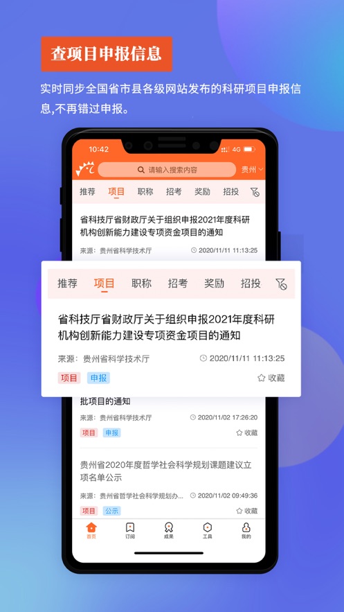 实时推送最新发布的各类科研申报、公示、立项等信息,让用户不再错过申报机会。