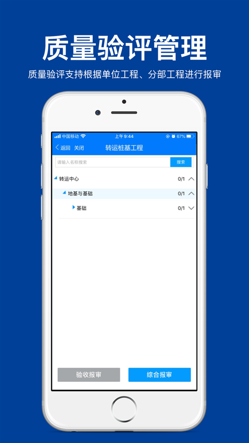 支持验收或巡检表单内容在移动端进行流程提交、审批(通过、驳回、转办等操作)、审批进度查询等功能,支持质量验评根据单位工程、分部工程进行报审。