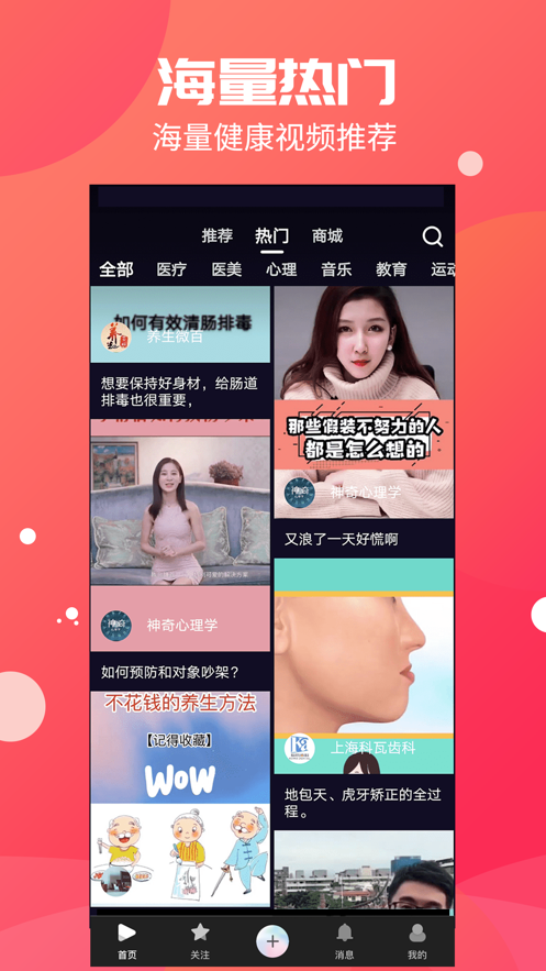 美健视频app视频涵盖,健康医疗、健康医美、健康心理、运动、健康、养生、中医、饮食、健康家居等板块,美健视频手机客户端为广大用户提供更多的健康科普专业知识普及,感兴趣的用户欢迎来yn下载站下载使用。