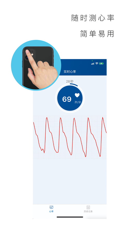 这款软件推荐给大家,欢迎下载使用,请把您的指尖轻放在后置相机镜头上,请不要用力按压,以免阻断指尖的血液循环并影响测量。