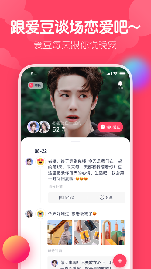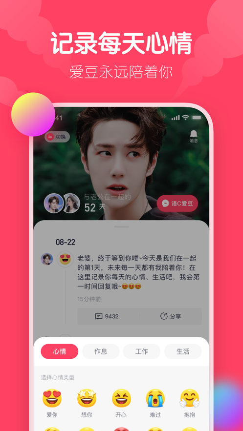 1、自定义设置爱豆身份,分享你的每一天心情和日记,爱豆随时随地都陪在你身边。