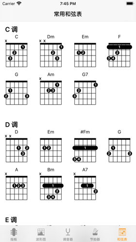 这款软件推荐给大家,欢迎下载使用,常用和弦表,让您练习和弦不再迷茫,可以帮助用户随时选择吉他进行模拟,拥有指板、波形图、调音器和节拍器以及和弦表等模块可以选择使用。