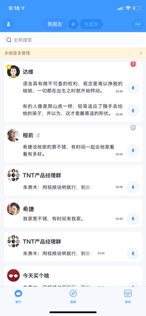聊天宝app的聊天功能与子弹短信一脉相承,除了顶部的模块设置有所变化外(将“所有消息”、“稍后处理”变更为“熟朋友”、“星标”、“生朋友”),其他并无差异;