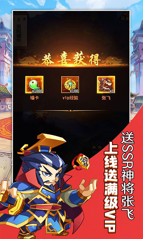 ★上线送VIP超2、SSR张飞*1、福卡*1000、元宝*88888、铜贝*1000W