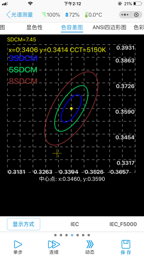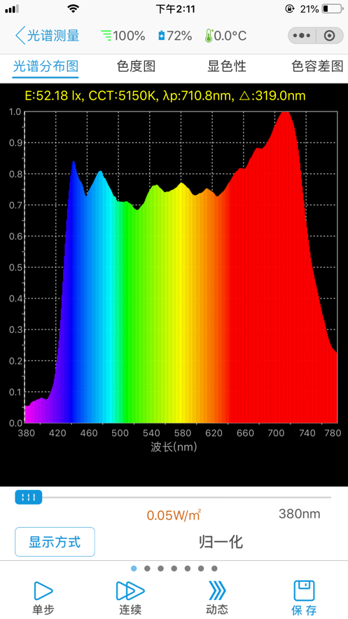 4.光谱分布、光照度和辐射照度、相关色温(CCT)、显色指数(Ra、R1~R15)、CIE 1931/CIE 1976色品坐标、色容差(SDCM)、峰值波长、主波长、色纯度等等。