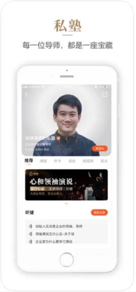 2、【私塾】。平台为每一位导师,打造一个私塾。导师可以通过平台发布课程、短视频、观点、线下课程,让学员可以更全面的了解导师;