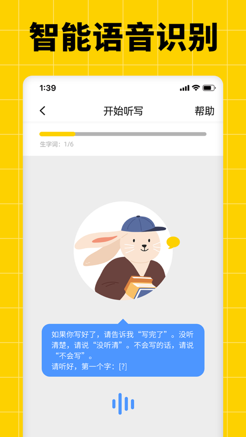 1、听写全程智能语音控制,播放听写任务字词,实时识别听写进度,让听写效率更高;