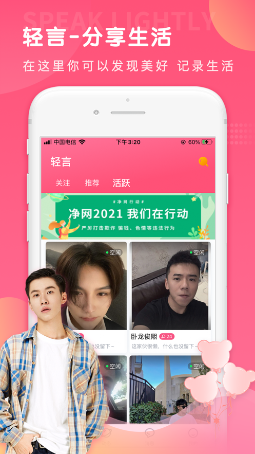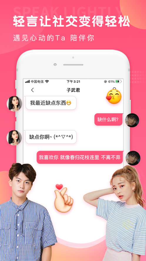 社交圈窄,有社交恐惧症,总是交不到新朋友怎么办?小编为大家带来了轻言app。这款软件里面入驻了超多有趣的用户,每一位用户的资料都经过审核,用户可以放心使用。在这里,你可以随时根据兴趣匹配合适的小伙伴。无论是聊天还是一起组队开黑都可以,你还可以分享自己的日常生活,让更多的人了解你。轻言下载地址请点击yn下载站!
