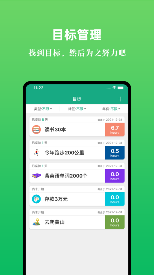 1、目标管理:创建每日事项时,可以为其指定为作为某目标的子事项,这样当为该事项计时时,就会自动计入该目标的投入时长;