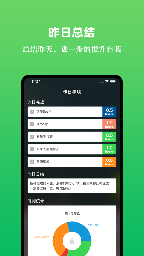 3、时间记录:晨间日记Pro软件下载后平台会将每天时间分为四大块:睡眠、投资、固定和浪费。