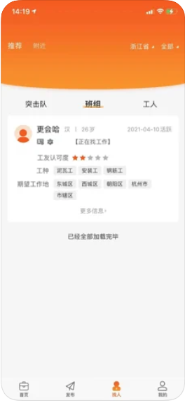 建筑、装修招工找活平台,拥有工地招工、工人找活、机械找活、工人劳务,已形成“招聘、发包、”能为建筑、工程类企事业单位以及相关从业人员提供基于大数据的高效智能匹配服务,有效解决建筑业人才供应,提高招聘和服务效率。作为建筑业互联网招聘领域的专家,橙领直聘集聚了建筑业、互联网领域的专家人才,从建筑业招聘的痛点出发,通过细分,精准匹配建筑人才求职特点,精准分发建筑业人才供求资讯、为招聘方提供精准、便捷的专业服务,已经初步在用户规模、业务基础、技术创新、用户体验等方面的核心竞争力和壁垒。