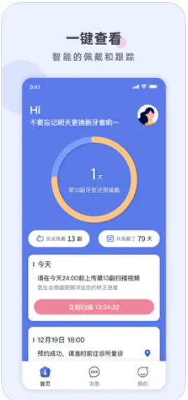 智能追踪你的牙套佩戴进度,随时随地查看今天应该佩戴的牙套副数。