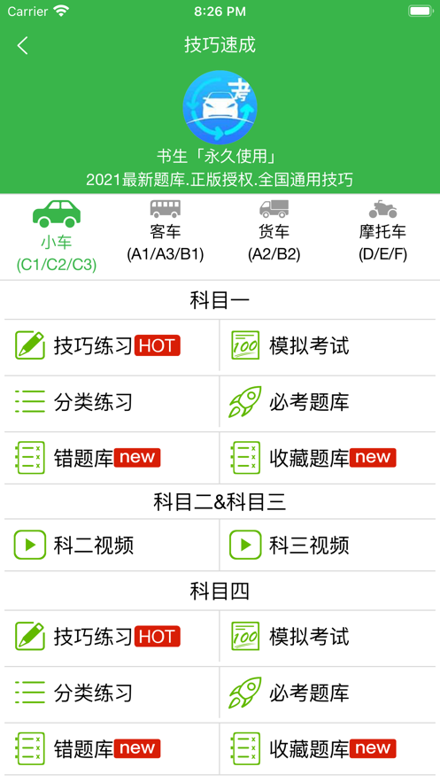 2、支持科目一到科目四内容和校车、客车和货车驾考学习内容;