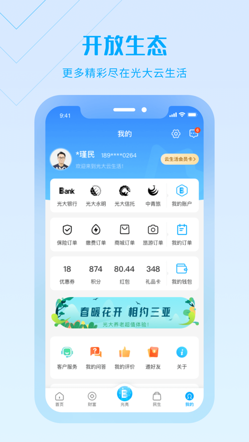 光大云生活app将金融服务融入生活场景中,提供云缴费、商城购物、旅游出行、健康养老、信用卡申请和账单查询、保单服务、证券开户等丰富的产品与服务,让专业的金融服务在您的生活场景中触手可及。光大云生活苹果版下载后为用户提供一站式综合服务,覆盖诸多生活场景。