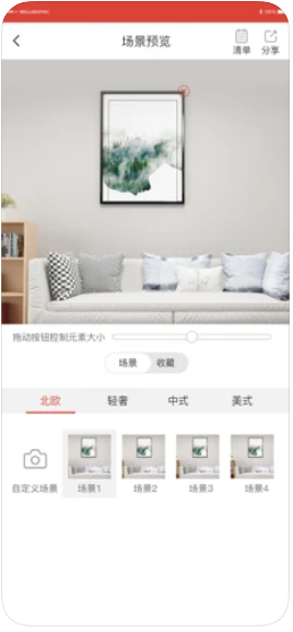 3、嘉艺画框app支持场景预览,自定义控制元素的大小,还可以分享该场景;