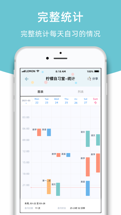 4、每日统计:自习数据均记录并有统计;