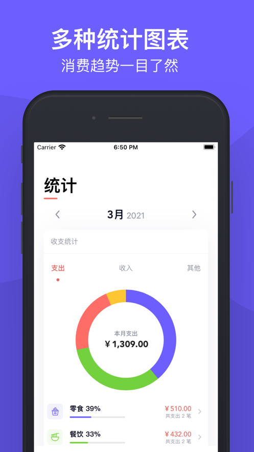 5.图表统计:一目了然的美观图表,帮你快速了解消费情况。