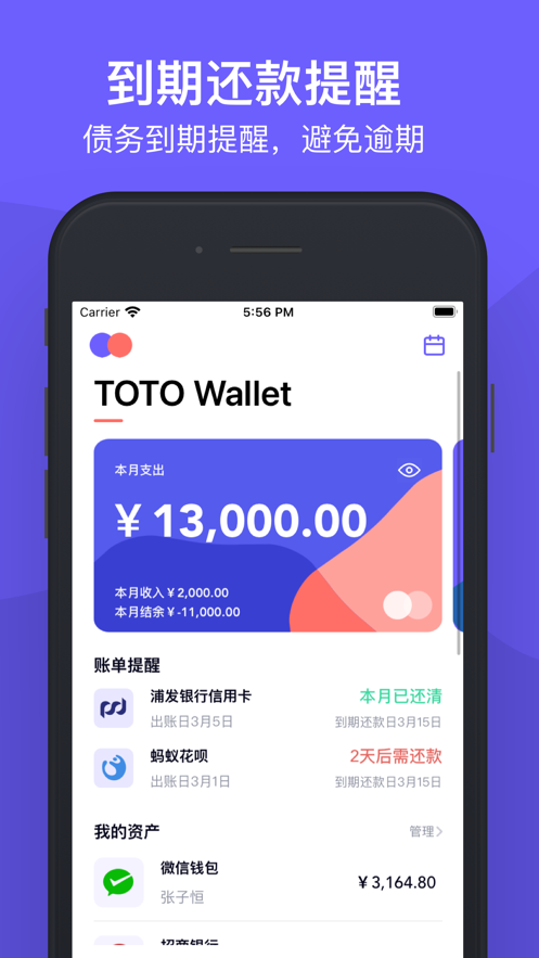 4.资产管理:可添加储蓄卡、信用卡等多种类型的资产账户;