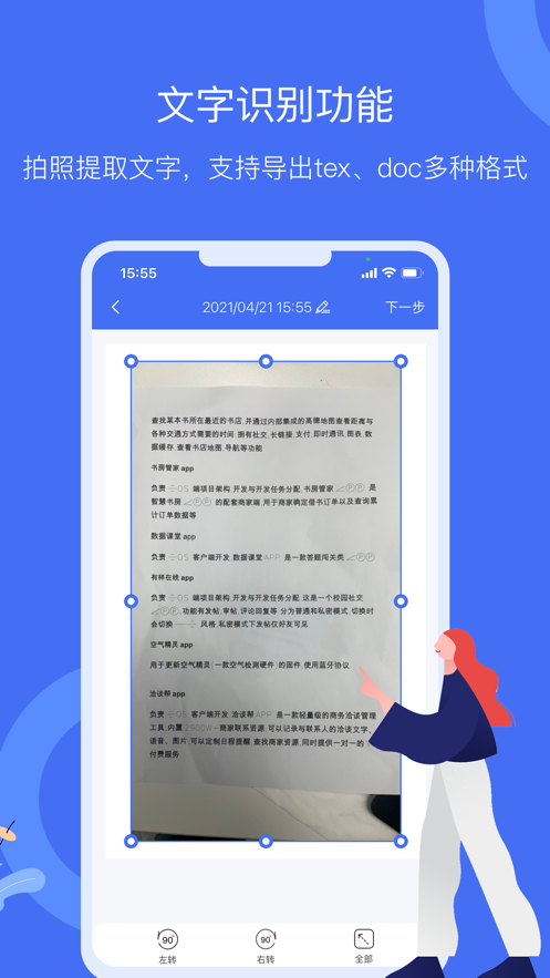 1、帮助用户扫描各种文件、图片、书籍、名片等提取想要的文字;