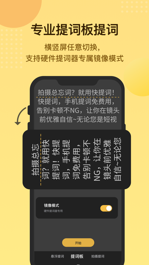 1、 专业提词板:横竖屏模式任意切换,提词区域大小、位置随意调整,还支持硬件提词器专属镜像模式;